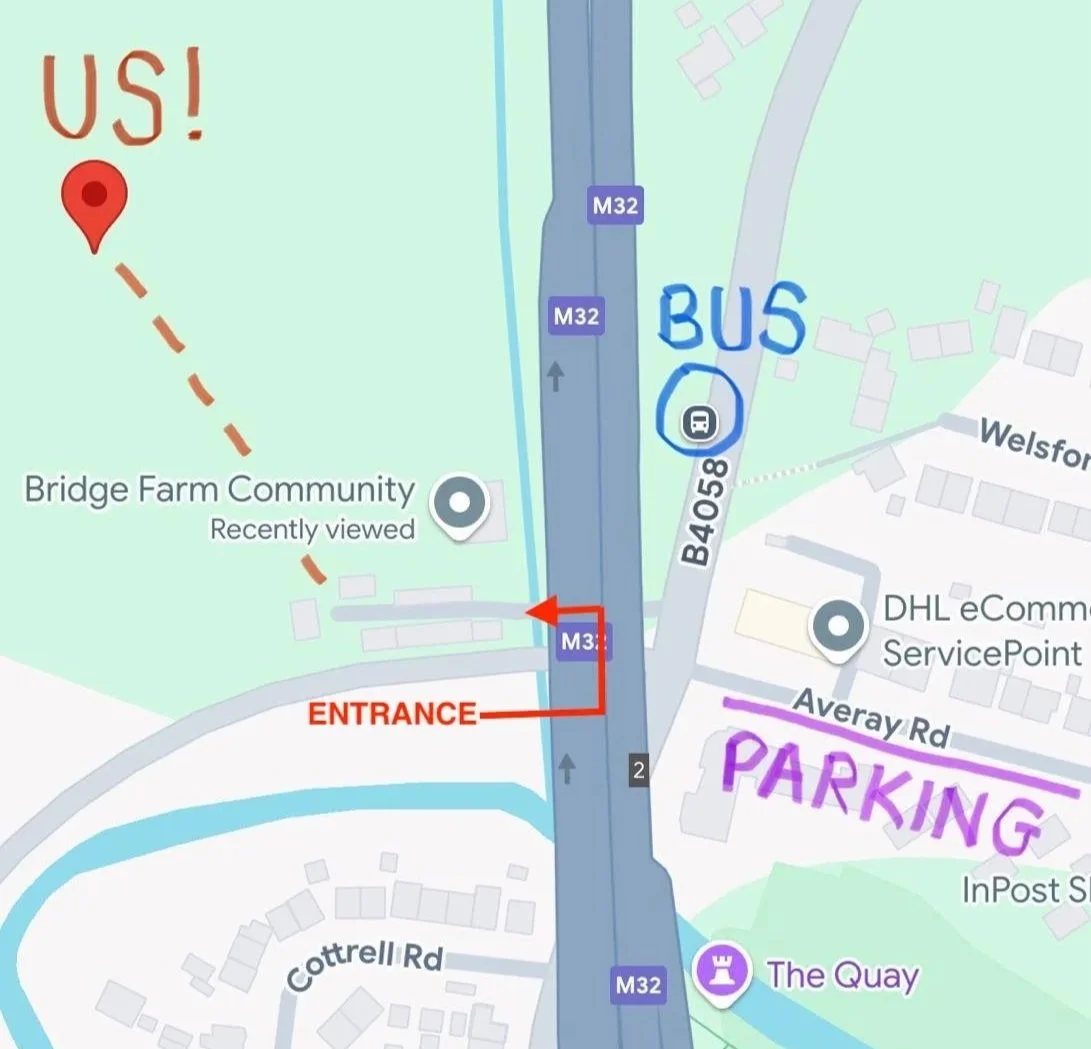 Once at the entrance to Bridge Farm (under the M32 - please be careful if crossing the road as it can be busy), you will see a large painted sign saying 'Bridge Farm' and another with 'Bristol Tree Craft'. Follow the driveway gently uphill into an unevenly cobbled courtyard, which turns into a gravel pathway. Follow this, passing to the right of the glass-fronted barn ahead of you and follow a track uphill (marked on the picture above in RED.) Some sections of this path are moderately steep, but there is a handrail for assistance. Our workshop is situated 120m up the track - you will see a large green tent and a 'Welcome!' sign, which means you've found us!
